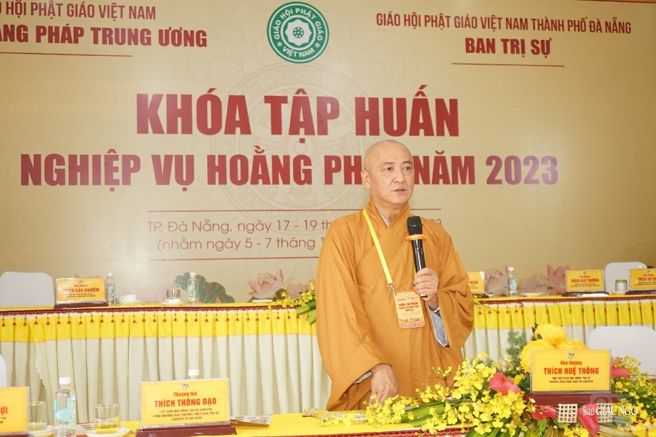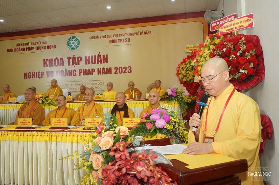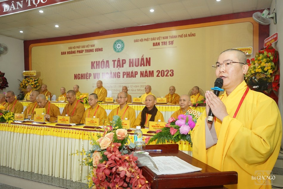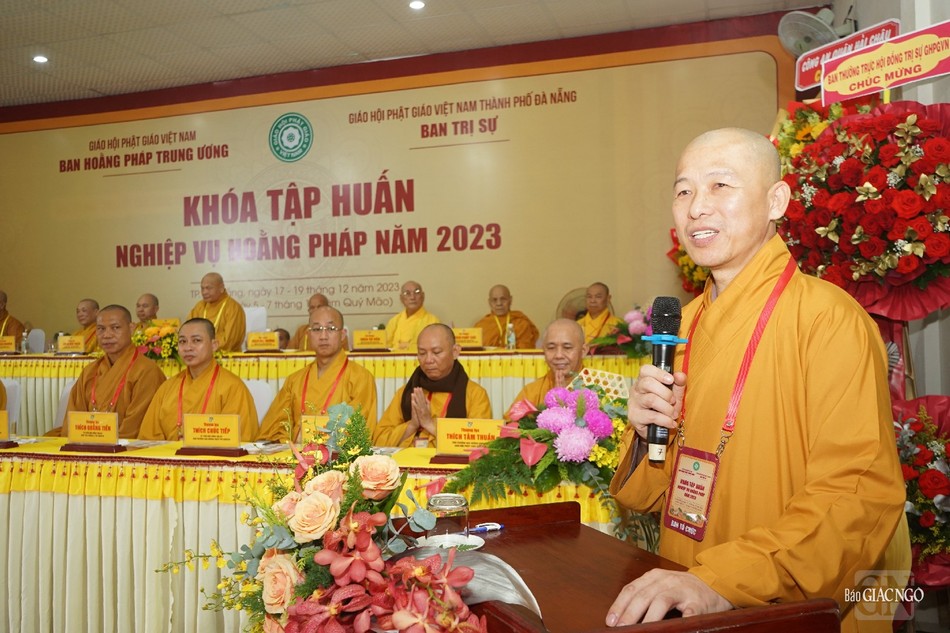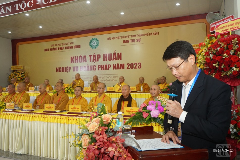 Đại diện chính quyền, ông Ngô Xuân Thắng, Ủy viên Ban thường vụ Thành ủy, Chủ tịch UBMTTQVN TP.Đà Nẵng phát biểu chúc mừng khóa tập huấn nghiệp vụ hoằng pháp năm 2023; ghi nhận định của Tăng Ni, Phật tử TP.Đà Nẵng trong năm với nhiều thành tựu nổi bật.