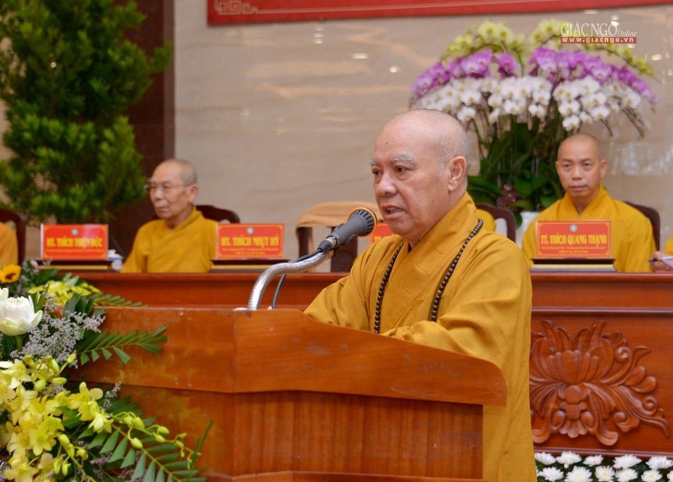 Đạo từ tại buổi lễ, Hòa thượng Thích Lệ Trang bày tỏ niềm hoan hỷ khi thấy tất cả hiện diện trong tinh thần đoàn kết, hòa hợp. Hòa thượng cho biết đại diện 3 ban vừa phát biểu nguyện gánh vác trọng trách với vai trò vừa đảm nhận. Với 3 ban, mỗi thành viên đều phải có kiến thức tổng quan cũng như chuyên môn riêng cùng với các ban trong 12 ban trực thuộc sẽ hỗ trợ, gắn kết cùng nhau thừa hành Phật sự. Trong mối tương quan với chức năng, chuyên môn của từng thành viên của mỗi ban cần nêu cao tinh thần hòa hợp, đoàn kết để giữ gìn chánh pháp, có những đóng góp để xây dựng, phát triển Phật giáo TP.HCM là trách nhiệm của Tăng sĩ.