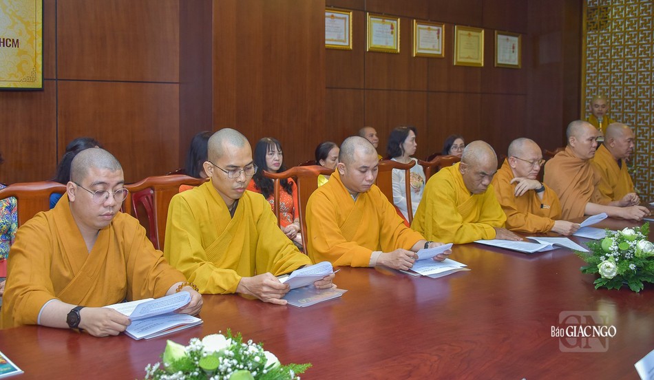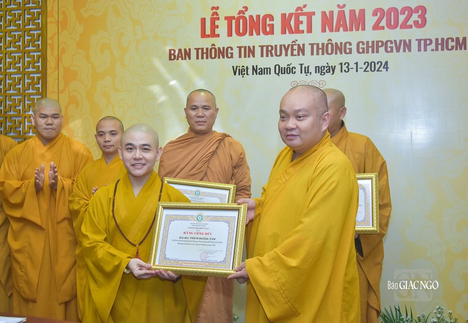 Dịp này, Ban Trị sự GHPGVN TP.HCM công bố quyết định và trao Bằng tuyên dương công đức và Bằng công đức đến 8 tập thể và cá nhân; Ban Thông tin - Truyền thông tặng Bằng công đức đến 5 tập thể trực thuộc và 7 cá nhân.