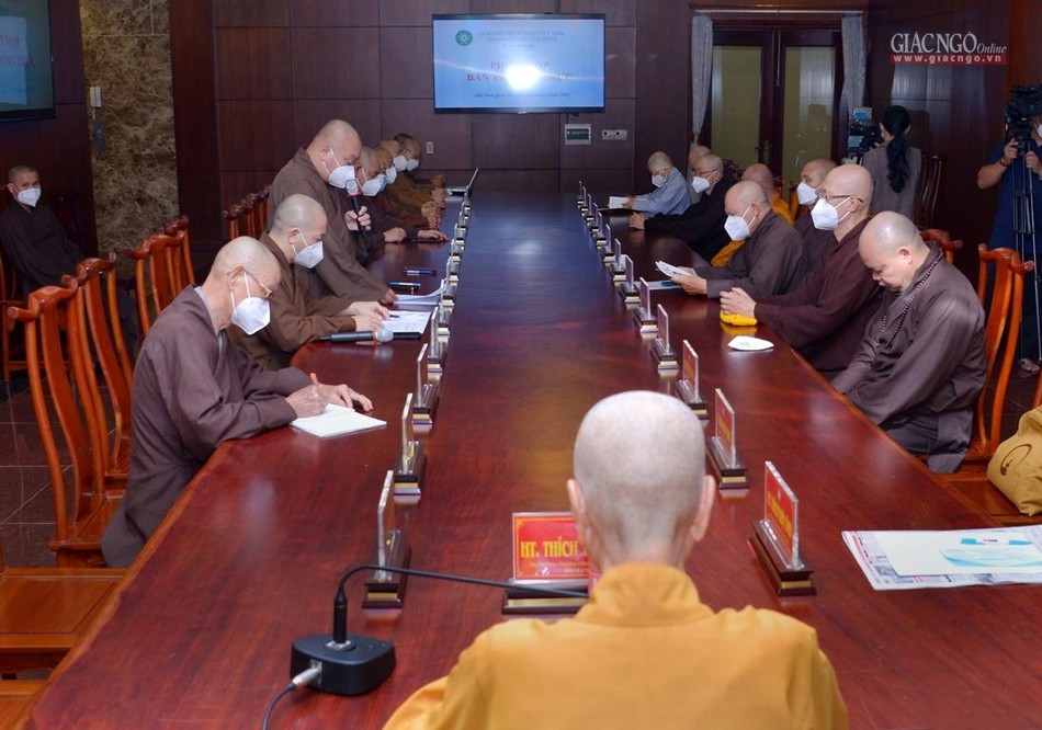 Đại diện Ban Thư ký Ban Trị sự, Thượng tọa Thích Quang Thạnh, Phó Thư ký kiêm Chánh Văn phòng Ban Trị sự trình kế hoạch thiết kế lễ đài chính Đại lễ Phật đản tại Việt Nam Quốc Tự, cùng danh sách dự kiến khách mời, sơ đồ lễ đài, thiết trí pano, biểu ngữ và các công việc khác nhằm bảo đảm an toàn phòng chống dịch đối với Tăng Ni, Phật tử tham dự Đại lễ Phật đản tập trung.