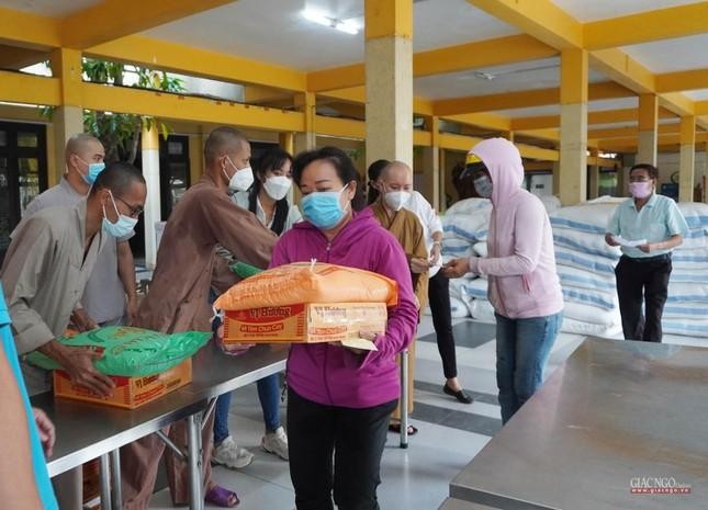 Mỗi phần quà gồm có 10 kg gạo, 1 thùng mì và bao lì xì 300 ngàn đồng, được chư Tăng Phật tử trao đến người bán vé số, xe ôm… trên địa bàn quận 3.