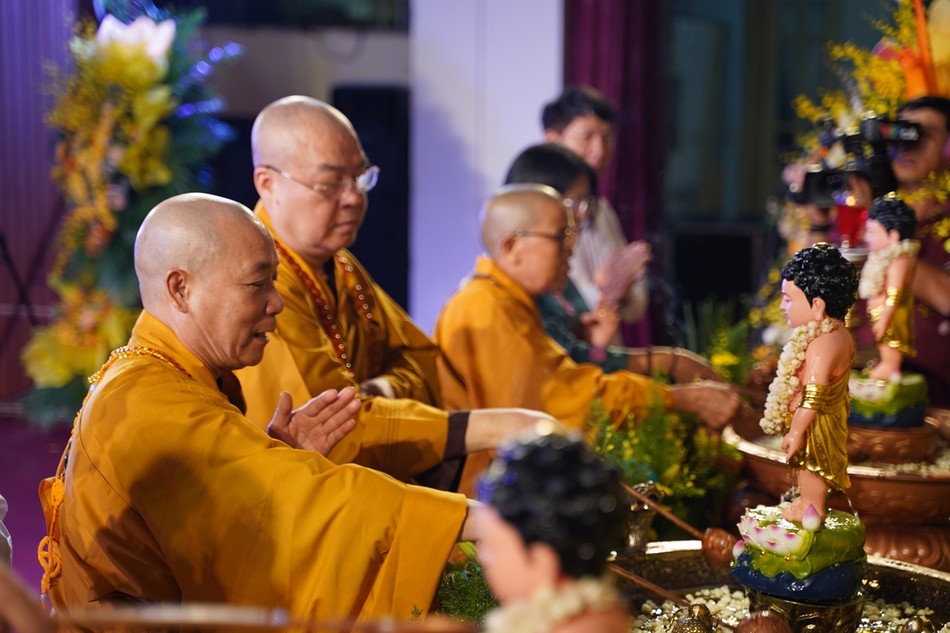 Sau lời phát biểu cảm tạ của Thượng tọa Thích Chiếu Tuệ, Phó Trưởng ban Trị sự Phật giáo TP, chư tôn đức cùng toàn thể đại chúng đã thực hiện nghi thức niêm hương, tụng kinh Chuyển Pháp luân và cử hành nghi thức Mộc dục trong tiếng niệm Phật âm vang trầm hùng.