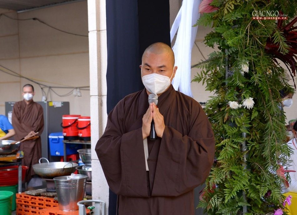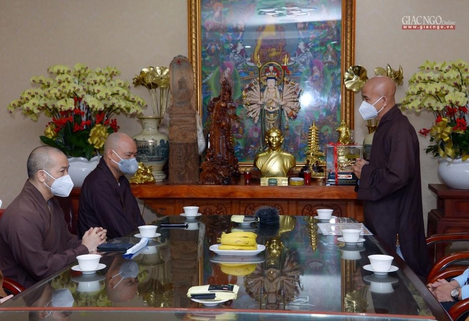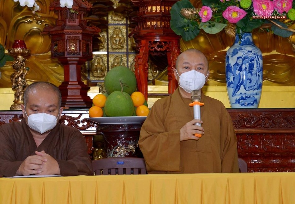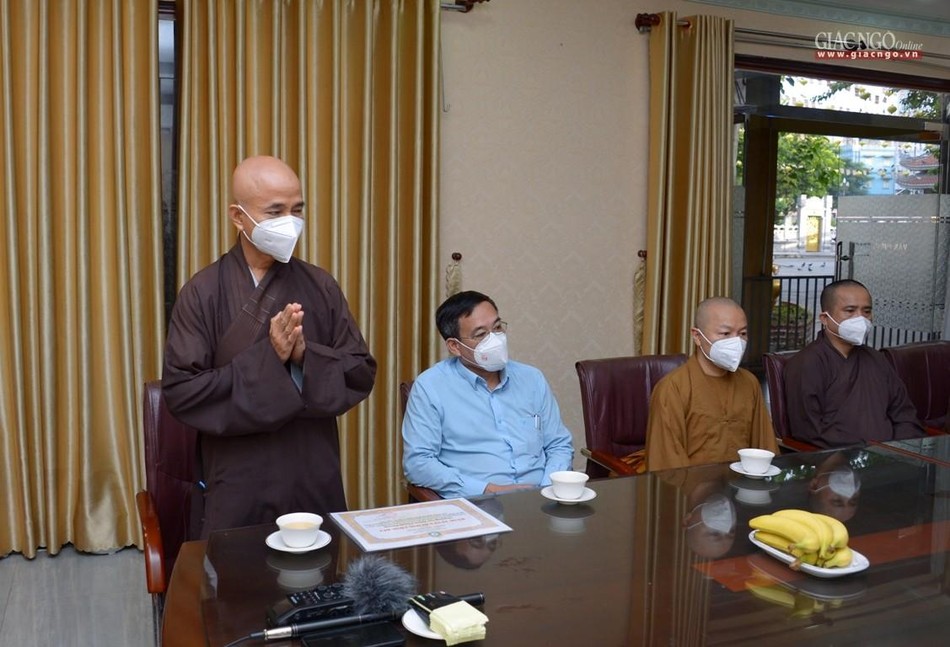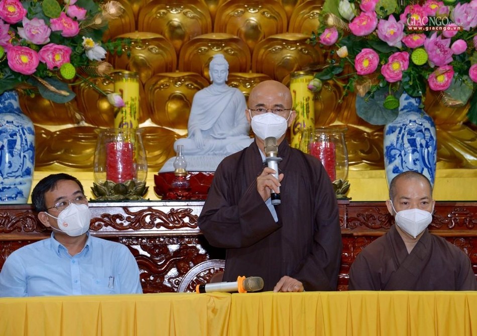 Thượng tọa Thích Thiện Quý thay mặt đoàn chuyển lời thăm hỏi, sách tấn của Trưởng lão Hòa thượng Thích Trí Quảng đến Thượng tọa Thích Thanh Phong, chư Tăng Ni và Phật tử đang thực hiện công tác thiện nguyện tại chùa Vĩnh Nghiêm, đồng thời ghi nhận những đóng góp thiết thực của chùa Vĩnh Nghiêm đối với các chương trình TTXH, đặc biệt trong công tác phòng, chống dịch Covid-19, ảnh hưởng lên mọi hoạt động của đời sống xã hội.