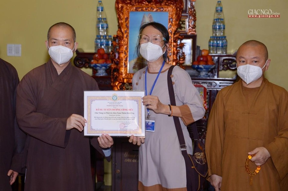 Dịp này, chư tôn đức cũng đã thay mặt Ban Thường trực Ban Trị sự GHPGVN TP.HCM trao Bằng Tuyên dương công đức và Bằng Công đức do Trưởng lão Hòa thượng Thích Trí Quảng ấn ký, tặng tịnh tài 20 triệu đồng đến mỗi cơ sở.