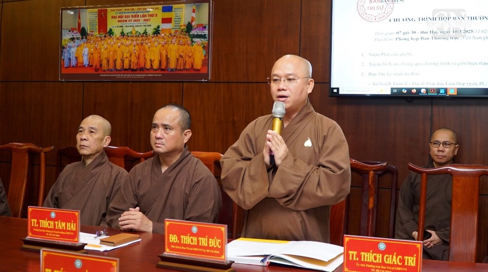 GNO - Sáng nay, 10-3, Ban Thường trực Ban Trị sự GHPGVN TP.HCM họp, thảo luận công việc tổ chức Đại lễ Phật đản, An cư kiết hạ Phật lịch 2569. Buổi họp diễn ra tại Việt Nam Quốc Tự với sự chủ trì của Hòa thượng Thích Lệ Trang, Phó Chủ tịch Hội đồng Trị sự, Trưởng ban Trị sự GHPGVN TP.HCM.
