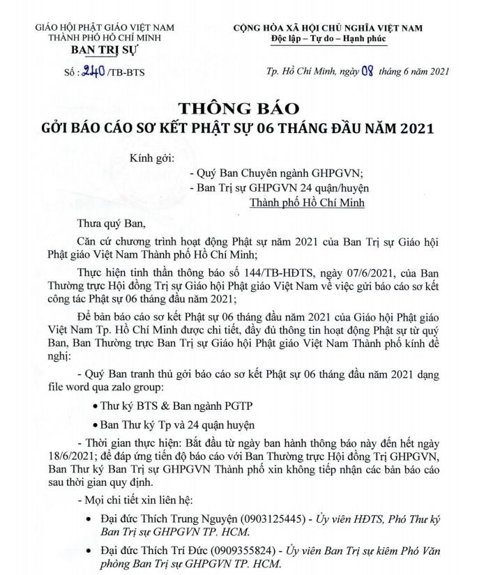 Theo đó, căn cứ chương trình hoạt động Phật sự năm 2021 của Ban Trị sự GHPGVN TP.HCM; Thực hiện tinh thần thông báo số 144/TB-HĐTS, ngày 7-6-2021 của Ban Thường trực Hội đồng Trị sự GHPGVN về việc gửi báo cáo sơ kết công tác Phật sự 6 tháng đầu năm 2021; Để bản báo cáo sơ kết Phật sự 6 tháng đầu năm 2021 của GHPGVN TP.HCM được chi tiết, đầy đủ thông tin hoạt động Phật sự từ các Ban, Ban Thường trực Ban Trị sự GHPGVN TP.HCM đề nghị, các Ban tranh thủ gửi báo cáo sơ kết Phật sự 6 tháng đầu năm 2021 dạng file word qua zalo group: Thư ký BTS & Ban ngành PGTP và Ban Thư ký TP và 24 quận huyện.