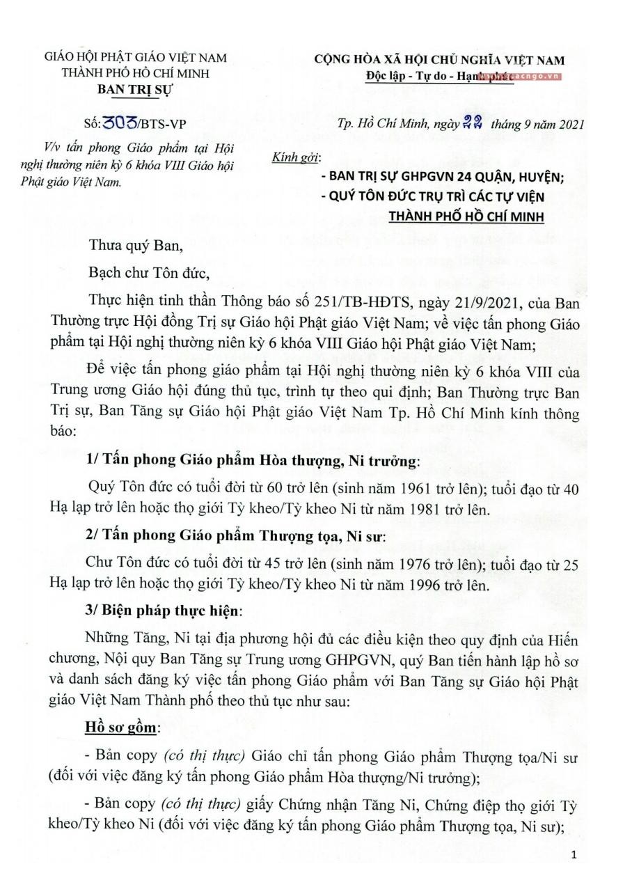 Những Tăng, Ni tại địa phương hội đủ các điều kiện theo quy định của Hiến chương, Nội quy Ban Tăng sự Trung ương GHPGVN, quý Ban tiến hành lập hồ sơ và danh sách đăng ký việc tấn phong giáo phẩm với Ban Tăng sự GHPGVN TP.HCM.