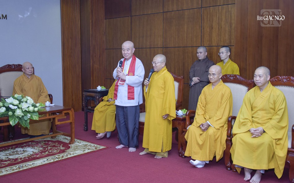 Thay mặt Ban Thường trực, Hòa thượng Thích Lệ Trang, Trưởng ban Trị sự GHPGVN TP.HCM phát biểu chào mừng chư Tăng, cư sĩ trong phái đoàn Ban Thư ký ABCP. Hòa thượng có lời thăm hỏi sức khỏe và cho biết đây là vinh dự đón tiếp phái đoàn đến thăm Ban Trị sự GHPGVN TP.HCM tại Việt Nam Quốc Tự, tìm hiểu về Phật giáo TP.HCM.