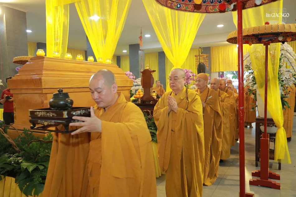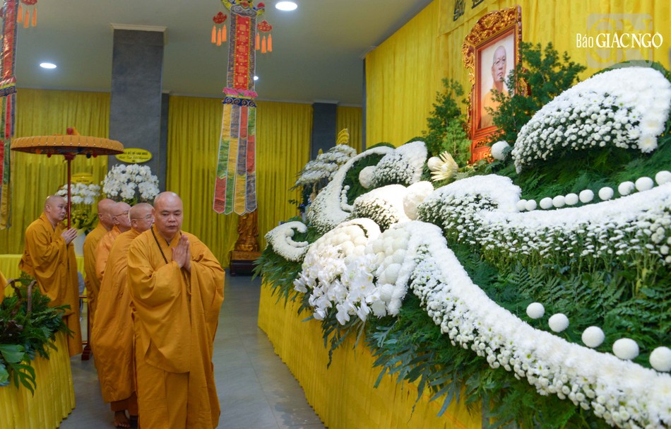 Trong niềm kính tiếc vị giáo phẩm có những đóng góp to lớn đối với sự phát triển của Phật giáo TP.HCM hơn 40 năm qua, chư tôn đức hữu nhiễu kim quan và ghi sổ tang lưu niệm.