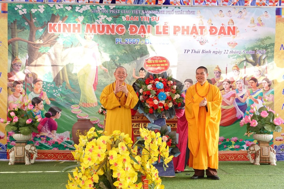 Quang lâm chứng minh buổi lễ có Trưởng lão Hòa thượng Thích Thanh Dục, Phó Pháp chủ GHPGVN; Thượng tọa Thích Thanh Hòa, Trưởng ban Trị sự GHPGVN tỉnh Thái Bình; Thượng tọa Thích Thanh Vượng, Phó Trưởng ban Thường trực Ban Trị sự GHPGVN tỉnh; Thượng tọa Thích Trí Sử, Trưởng ban Trị sự GHPGVN TP.Thái Bình; cùng chư tôn đức Tăng Ni Ban Thường trực Ban Trị sự GHPGVN tỉnh; chư tôn đức đại diện Ban Trị sự các huyện trong tỉnh; chư Tăng Ni trong địa bàn TP; đại diện lãnh đạo, các ban ngành tỉnh Thái Bình, thành phố và địa phương sở tại,...