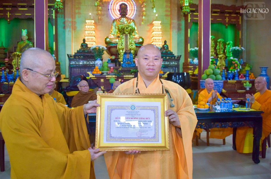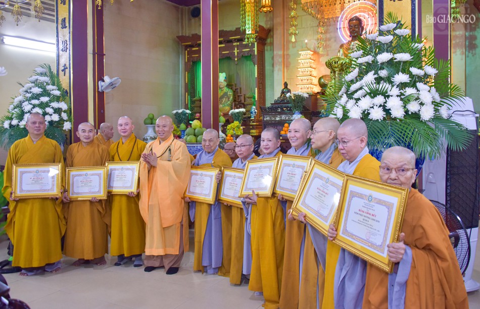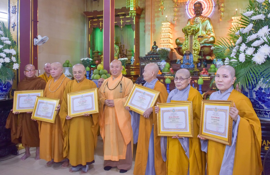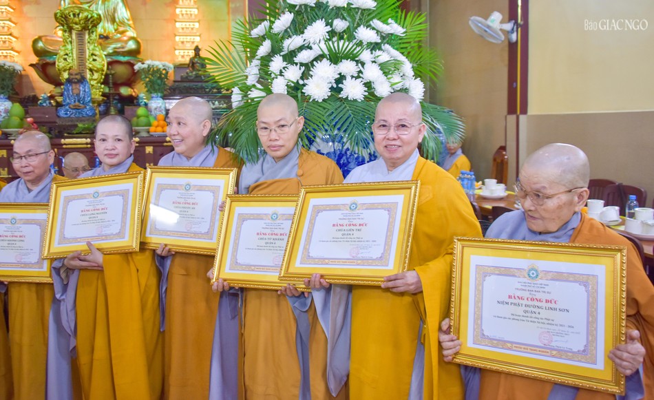 Tri ân những đóng góp mà Ban Trị sự Phật giáo Q.4 đã đạt được thời gian qua, Ban Trị sự GHPGVN TP.HCM trao Bằng tuyên dương công đức, Bằng công đức đến tập thể và cá nhân đã hoàn thành công tác Phật sự và có nhiều thành tích nổi bật trong công tác từ thiện xã hội.