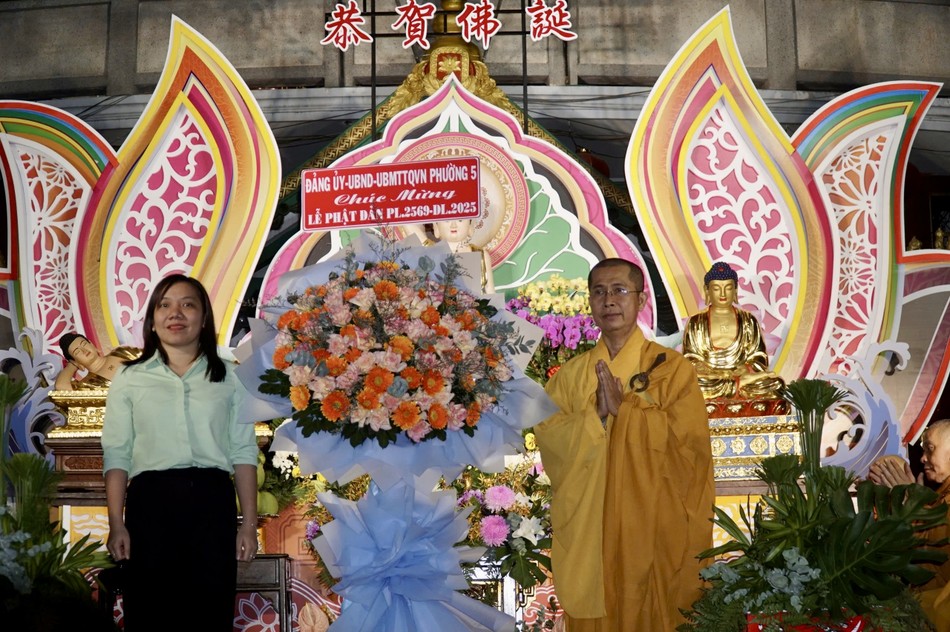 Dịp này, Ban Trị sự GHPGVN Q.5 đón nhận nhiều lẵng hoa và nhiều phần quà Kính mừng Đại lễ Phật đản được các cơ quan chức năng, chính quyền sở tại trao tặng.