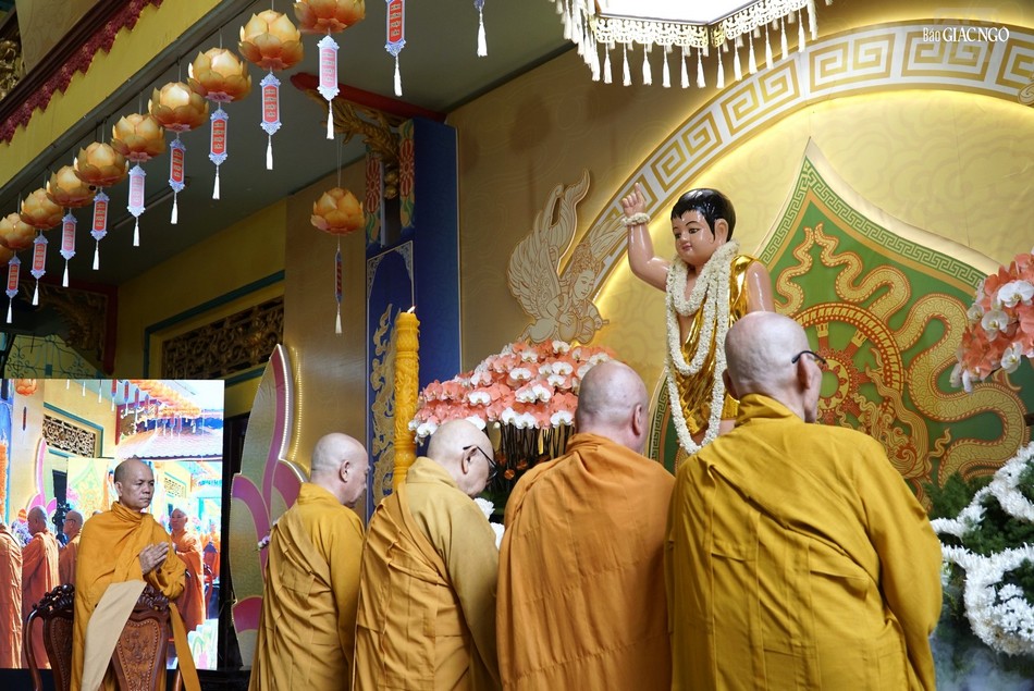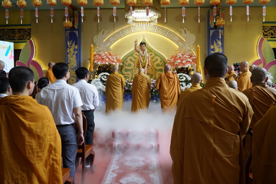 Sau ba hồi chuông trống Bát-nhã rước lễ Đản sanh, niệm hương, chư tôn đức tham dự đại lễ cử hành khóa lễ tụng sám Khánh đản.