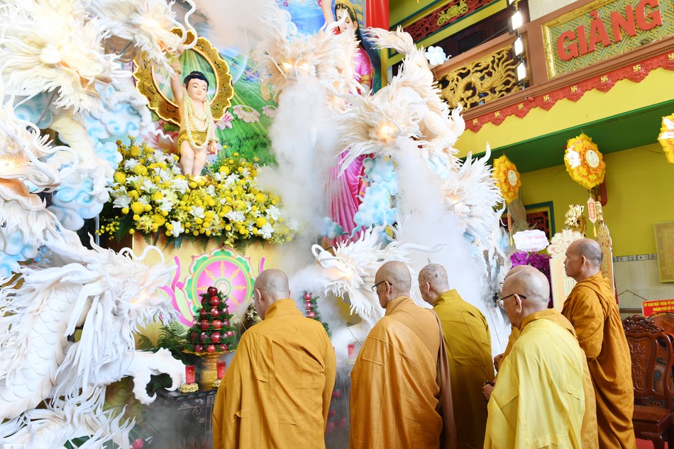 Sau ba hồi chuông trống Bát-nhã rước lễ Đản sanh, niệm hương, chư tôn đức tham dự đại lễ cử hành khóa lễ tụng sám Khánh đản theo truyền thống.