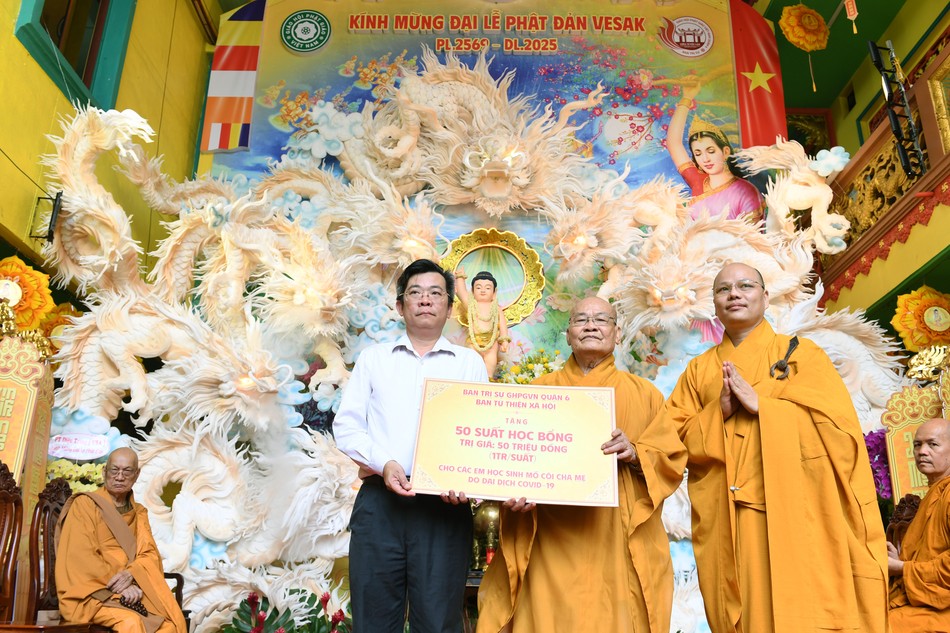 Dịp này, Ban Trị sự GHPGVN Q.6 trao tặng 50 suất học bổng cho học sinh có nhiều nỗ lực vượt khó, học sinh mồ côi do ba mẹ qua đời trong dịch Covid-19.