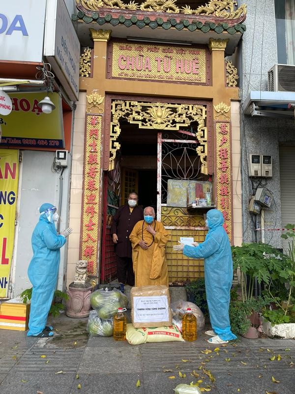 Do chùa nằm trong khu vực phong tỏa, Ni sư Thích nữ Như Thiền, trụ trì chùa Hương Nghiêm ra đầu hẻm nhận cúng dường của Ban Trị sự Phật giáo quận |