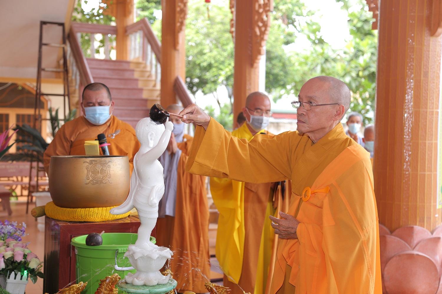 Chư tôn đức đã thực hiện nghi thức truyền thống: niêm hương Tam bảo, tụng bài sám Khánh đản mừng ngày Đức Phật đản sảnh và trang nghiêm thực hiện nghi thức Tắm