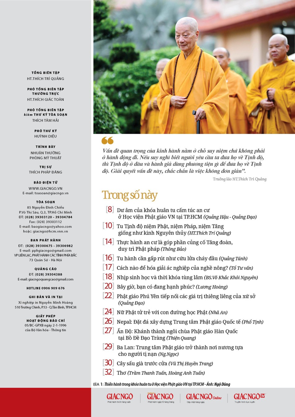 - Mục Quốc tế: "Nepal: Đặt đá xây dựng Trung tâm Phật giáo Quốc tế" (Phổ Tịnh tổng hợp); "Ấn Độ: Khánh thành ngôi chùa Phật giáo Hàn Quốc tại Bồ Đề Đạo Tràng" (Thiện Quang dịch); "Ba Lan: Trung tâm Phật giáo trở thành nơi nương tựa cho người tị nạn" (Nh.Ngọc tổng hợp).