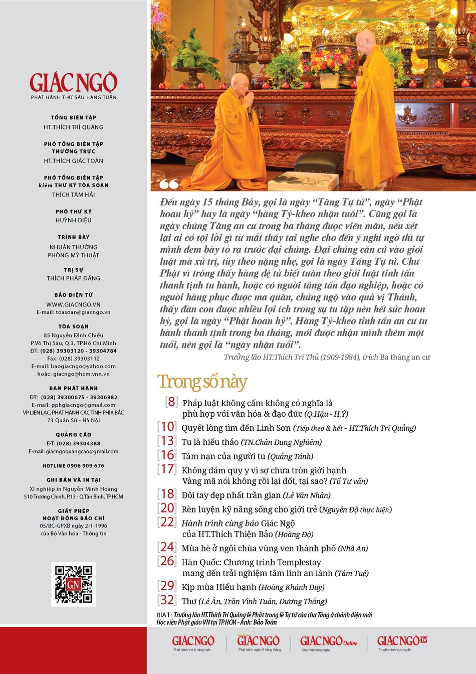 - Mục Văn hóa: "Rèn luyện kỹ năng sống cho giới trẻ" (Nguyên Độ thực hiện); "Giới thiệu sách Hành trình cùng báo Giác Ngộ của Hòa thượng Thích Thiện Bảo" (Hoàng Độ).