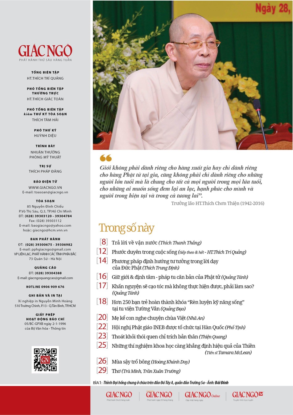 - Chuyên mục Phật học có đăng phần tiếp theo bài giảng: "Phước duyên trong cuộc sống" của Hòa thượng Thích Trí Quảng; "Phương pháp định hướng tư tưởng trong lời dạy của Đức Phật", tác giả Thích Trung Định.