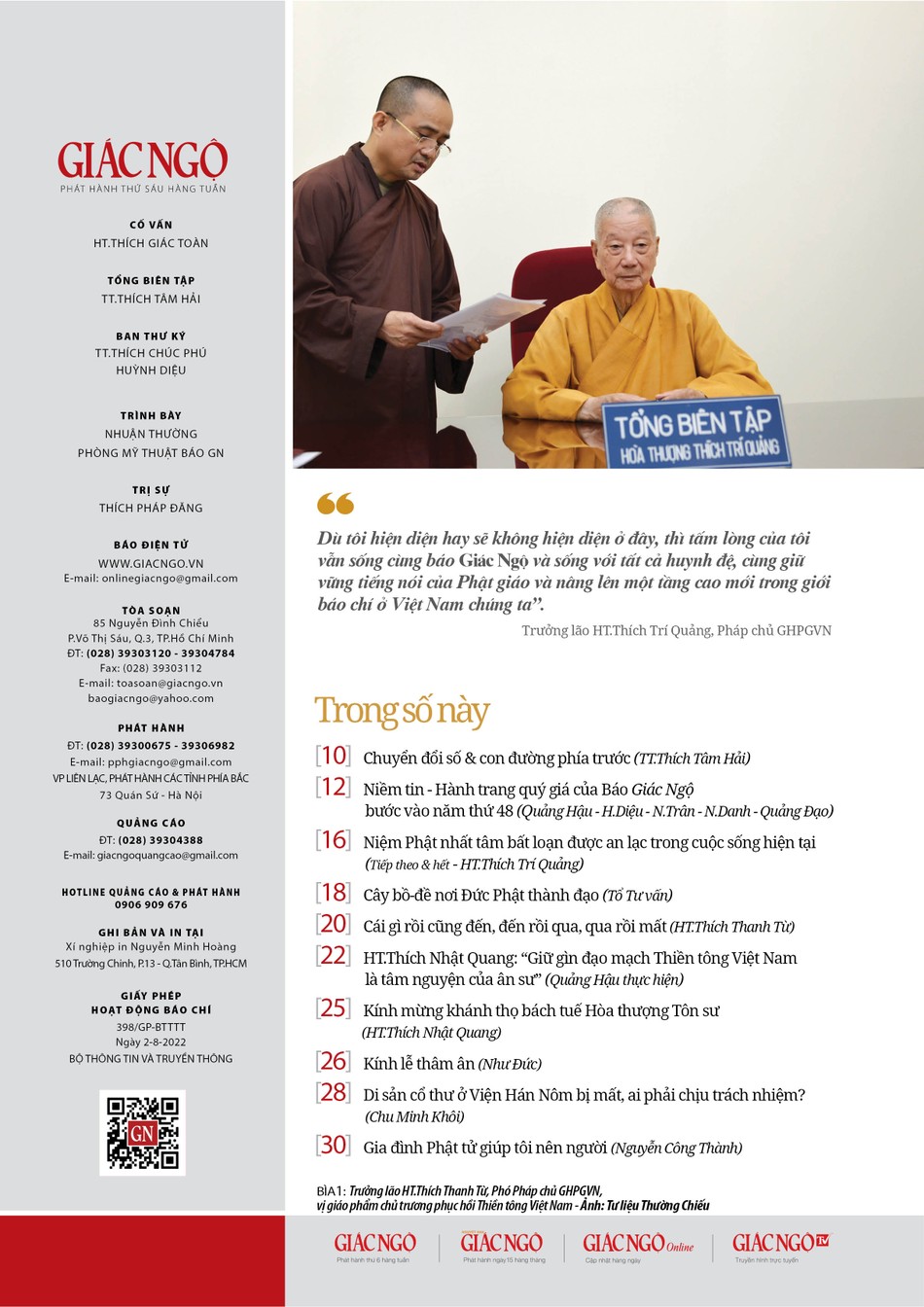 - Mục Điểm nhìn có đăng bài viết "Chuyển đổi số và con đường phía trước" của Tổng Biên tập - Thượng tọa Thích Tâm Hải nhân kỷ niệm 47 năm ngày báo Giác Ngộ ra số đầu tiên.