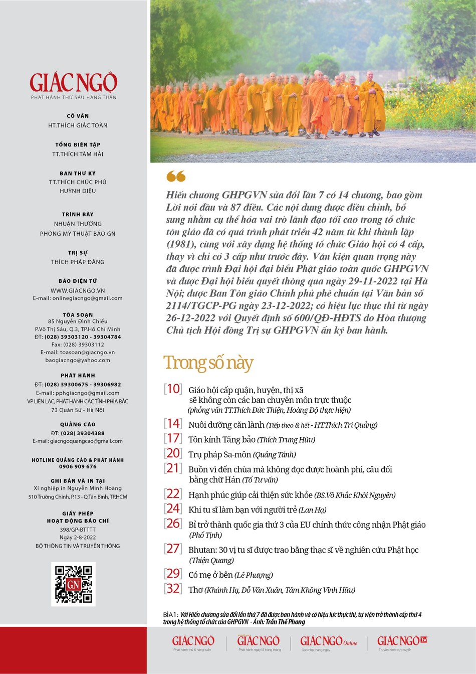 Mời quý Tăng Ni, độc giả đón đọc bài phỏng vấn đầu tiên liên quan tới lộ trình thực thi những điểm mới trong Hiến chương sửa đổi lần thứ 7, của Báo Giác Ngộ với Thượng tọa Thích Đức Thiện, Phó Chủ tịch kiêm Tổng Thư ký Hội đồng Trị sự GHPGVN, trên mục Điểm nhìn, Báo Giác Ngộ số 1195, ra ngày 31-3.
