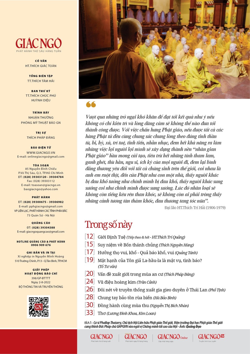 Cũng trong số này, mục Phật học: Trân trọng giới thiệu cùng bạn đọc phần tiếp theo bài giảng "Giới Định Tuệ" của Trưởng lão Hòa thượng Thích Trí Quảng; "Suy niệm về Bốn thánh chủng (Thích Nguyên Hùng).