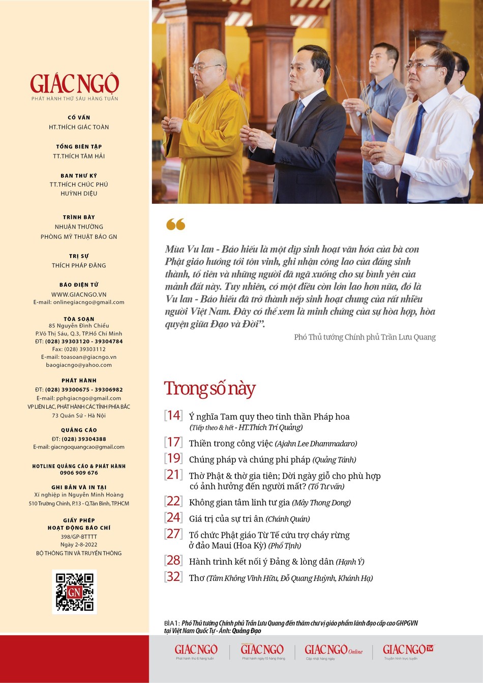 - Các chuyên mục khác: "Không gian tâm linh tư gia" (Mây Thong Dong); "Tổ chức Phật giáo Từ Tế cứu trợ cháy rừng ở hòn đảo Maui (Hoa Kỳ)" (Phổ Tịnh tổng hợp); "Hành trình kết nối ý Đảng và lòng dân" (Hạnh Ý),...