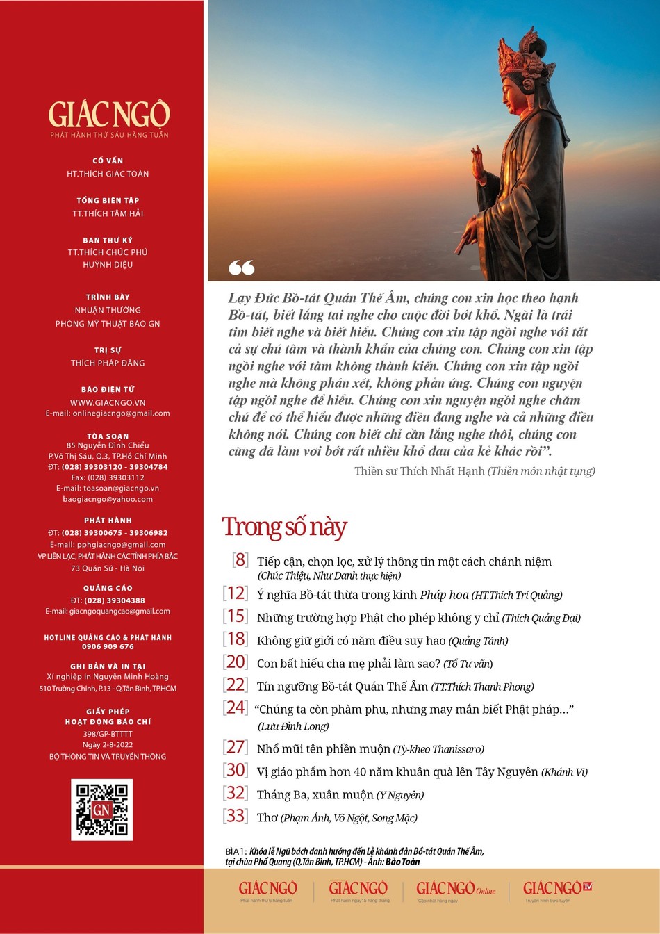- Mục Điểm nhìn: Tiếp tục vấn đề nghe pháp như thế nào cho có lợi lạc, mời bạn đọc cùng theo dõi những ghi nhận các ý kiến qua bài viết "Tiếp cận, chọn lọc, xử lý thông tin một cách chánh niệm" do Chúc Thiệu - Như Danh thực hiện.