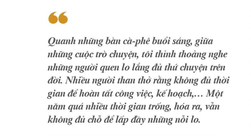 Thế nhưng thực tế lại không như nghĩ, tháng Chạp tới, người ta vẫn bận rộn, tất bật, vẫn phải xoay xở với hàng trăm nỗi lo: công việc, gia đình, buôn bán thế nào, về quê, đi lại ra sao. Quanh những bàn cà-phê buổi sáng, giữa những cuộc trò chuyện, tôi thỉnh thoảng nghe những người quen lo lắng đủ thứ chuyện trên đời. Nhiều người than thở rằng không đủ thời gian để hoàn tất công việc, kế hoạch,… Một năm quá nhiều thời gian trống, hóa ra, vẫn không đủ chỗ để lấp đầy những nỗi lo.
