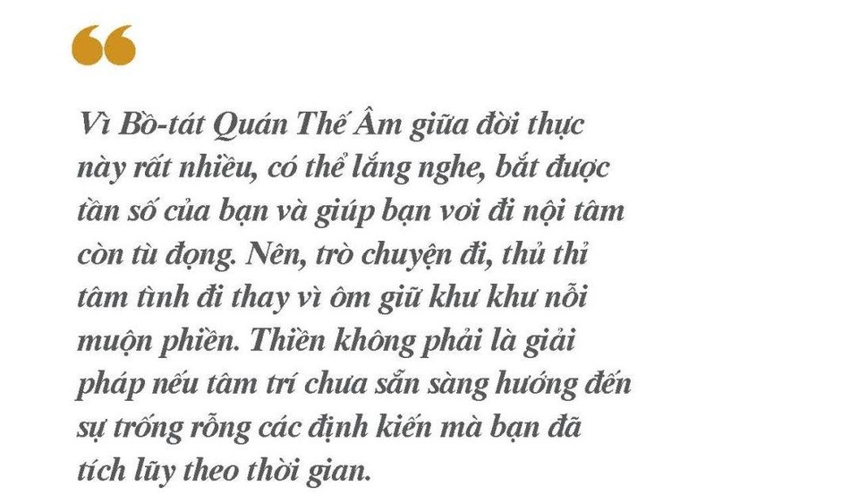 Vì Bồ-tát Quán Thế Âm giữa đời thực này rất nhiều, có thể lắng nghe, bắt được tần số của bạn và giúp bạn vơi đi nội tâm còn tù đọng. Nên, trò chuyện đi, thủ thỉ tâm tình đi thay vì ôm giữ khư khư nỗi muộn phiền. Thiền không phải là giải pháp nếu tâm trí chưa sẵn sàng hướng đến sự trống rỗng các định kiến mà bạn đã tích lũy theo thời gian.