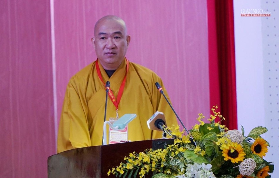 | Đại đức Thích Trí Thuận trình bày báo cáo hoạt động Phật sự khóa VI |
