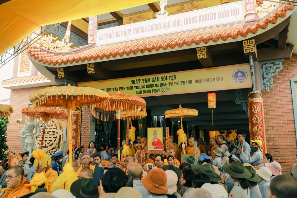 Trong tiếng chuông trống Bát-nhã, tiếng niệm Phật chí thành của những người con Phật, kim quan cố Hòa thượng Thích Đồng Quả được cung thỉnh rời Giác linh đường đến nơi trà-tỳ.