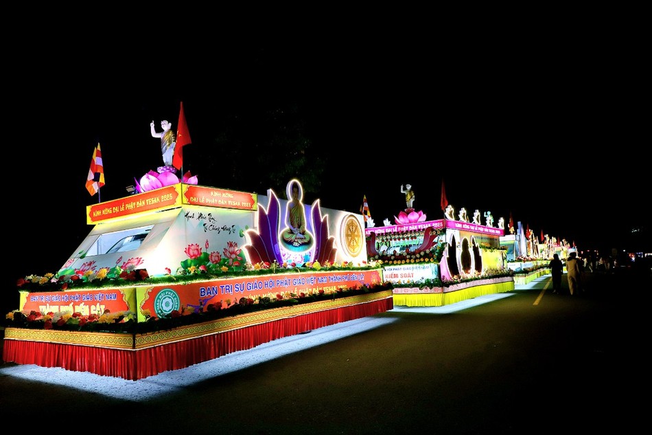 | Trước đó, tối 13-4-Ất Tỵ, Ban Trị sự GHPGVN tỉnh Bình Dương đã tổ chức diễu hành 20 chiếc xe hoa và văn nghệ cúng dường mừng ngày Khánh đản của Đức Phật |