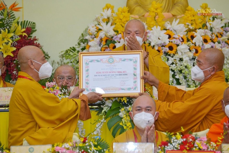 Ghi nhận những đóng góp của Giáo hội tỉnh, GHPGVN trao Bằng Tuyên dương công đức và Bằng công đức đến 1 tập thể và 31 cá nhân; UBND tỉnh Bình Dương tặng Bằng khen đến 8 tập thể và 12 cá nhân; Ủy ban MTTQVN tỉnh Bình Dương tặng Bằng khen đến 6 tập thể và 22 cá nhân.
