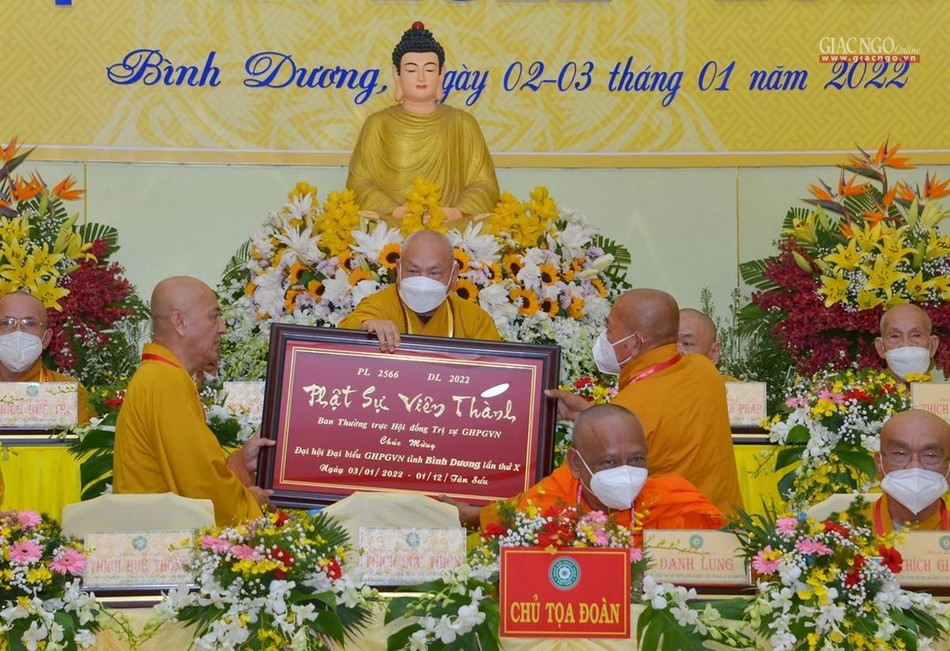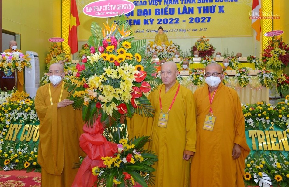 Đại hội đón nhận lẵng hoa chúc mừng của Đức Trưởng lão Hòa thượng Thích Trí Quảng, Quyền Pháp chủ GHPGVN; ông Nguyễn Minh Triết, nguyên Chủ tịch nước gởi đến đại hội chúc mừng, cùng lẵng hoa chúc mừng của Hội đồng Trị sự, lãnh đạo tỉnh Bình Dương được trao tặng tại đại hội.