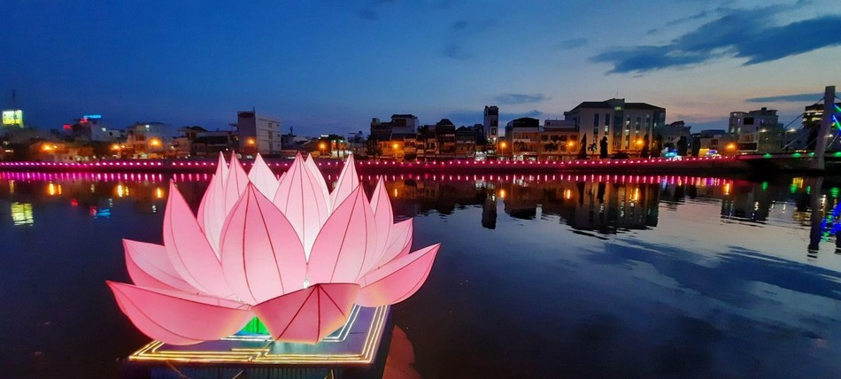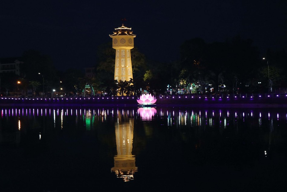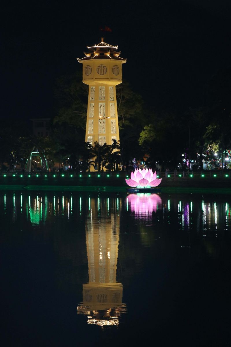 GNO - Kính mừng Đại lễ Phật đản Phật lịch 2567, tối ngày 16-5 (27-3-Quý Mão), tại khu vực tháp nước tỉnh Bình Thuận (đường Bà Triệu), Ban Trị sự GHPGVN tỉnh, Ban Tổ chức Đại lễ Phật đản và Tiểu ban Thiết trí xe hoa - lễ đài đã hạ thủy thử nghiệm đóa hoa sen hồng.