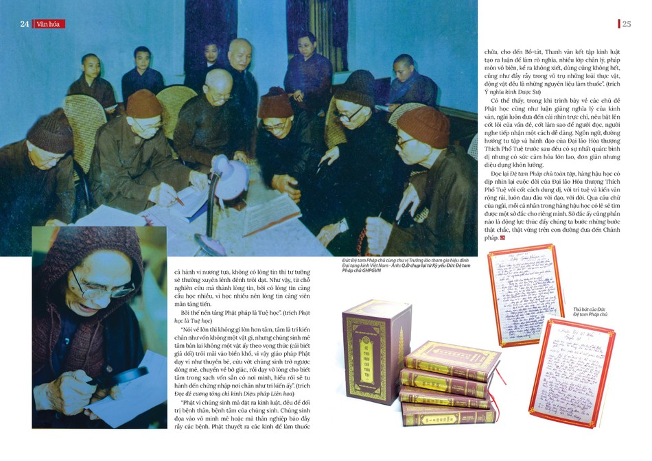 Những kinh văn được ngài dịch thuật, luận giảng cũng đều là những kinh văn căn bản, có liên hệ trực tiếp và gần gũi với sự tu học của bốn chúng. Tu học chuyên cần cũng là điều mà lúc sinh thời, mỗi lần Tăng Ni, Phật tử đến vấn an, thăm hỏi, Đức Đệ tam Pháp chủ luôn hết lòng nhắc nhở, căn dặn. Đọc lại các trước tác của ngài, chúng ta nhận ra rất rõ những điều này: