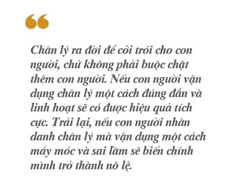 Chân lý ra đời để cởi trói cho con người, chứ không phải buộc chặt thêm con người. Nếu con người vận dụng chân lý một cách đúng đắn và linh hoạt sẽ có được hiệu quả tích cực. Trái lại, nếu con người nhân danh chân lý mà vận dụng một cách máy móc và sai lầm sẽ biến chính mình trở thành nô lệ. Song, không phải ai cũng có thể nhận thức rõ điều đó.