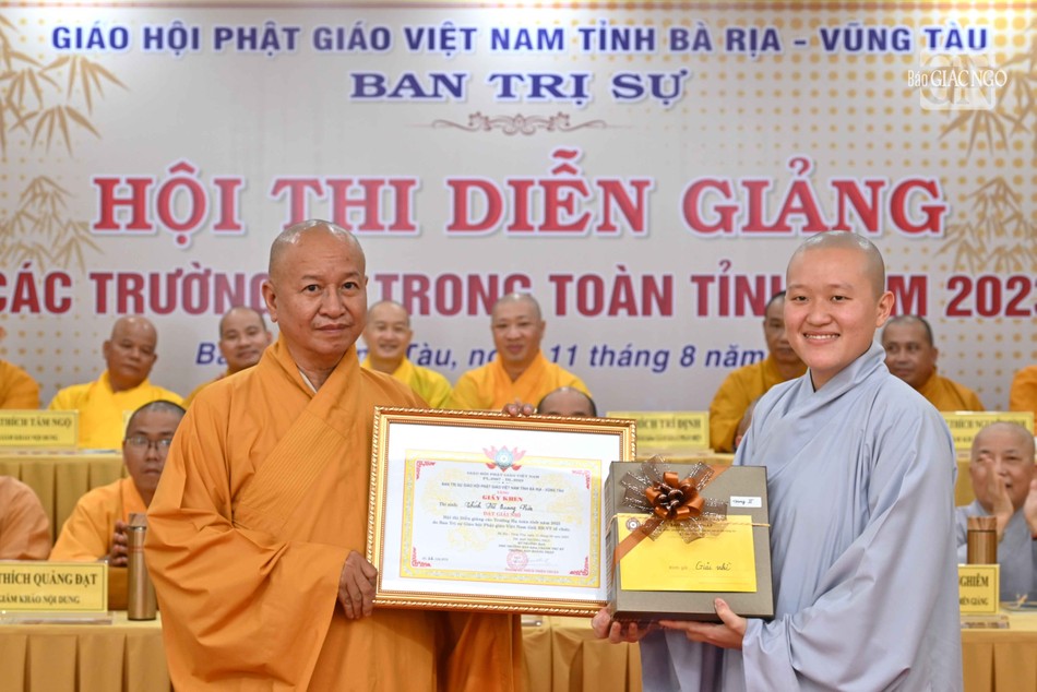 Sau hơn 3 giờ diễn ra hội thi, Ban Tổ chức đã công bố kết quả và trao thưởng, theo đó, giải Nhất thuộc về Đại đức Thích Quảng Lợi, trường hạ chùa Vạn Thiện; giải Nhì thuộc về Sư cô Thích nữ Quang Hòa, trường hạ Ni viện Thiện Hòa; giải Ba thuộc về Đại đức Thích Nguyện Truyền, trường hạ chùa Liên Trì; 5 giải Khuyến khích được trao đến Sư cô Thích nữ Như Nhã, Sư cô Thích nữ Giới Nguyện, Đại đức Thích Minh Thức, Đại đức Thích Hiền Đạo, Sư cô Thích nữ Huệ Đoan.