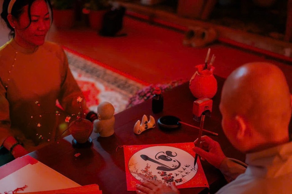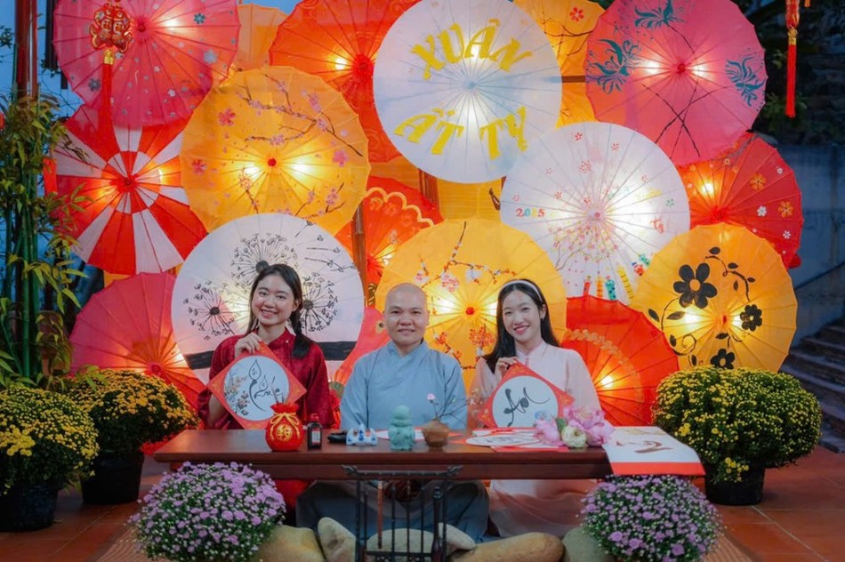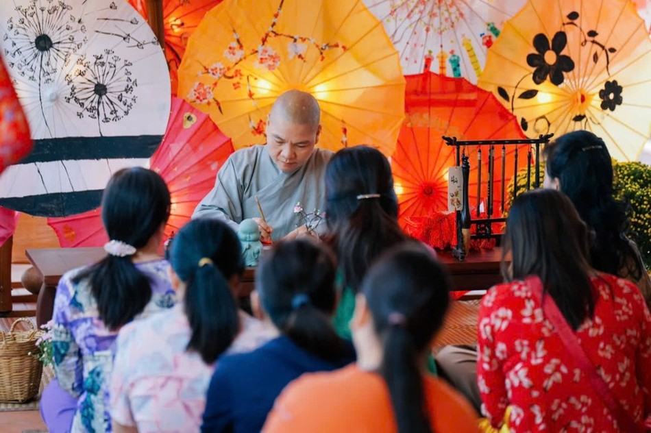 Bên cạnh việc nhận những lộc xuân của chùa, Sư cô Huệ Trí cũng trực tiếp viết trao tặng các bức liễn thư pháp Tết từ 8 giờ đến 10 giờ sáng cho các Phật tử, người dân đến chùa đến hết ngày mùng 3 Tết.