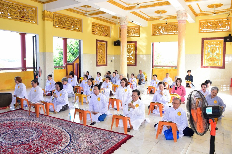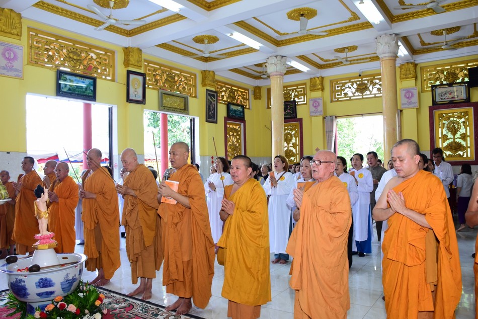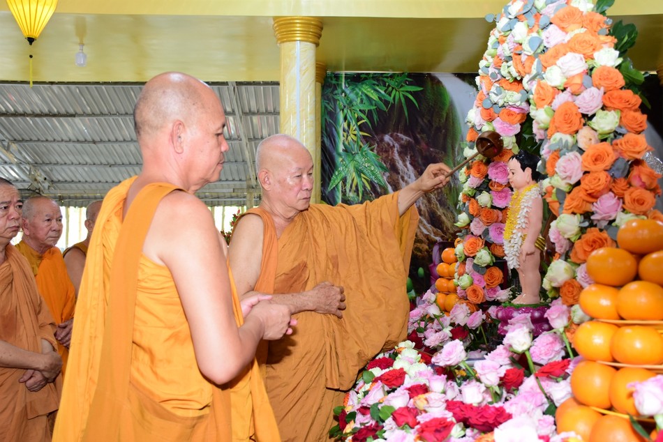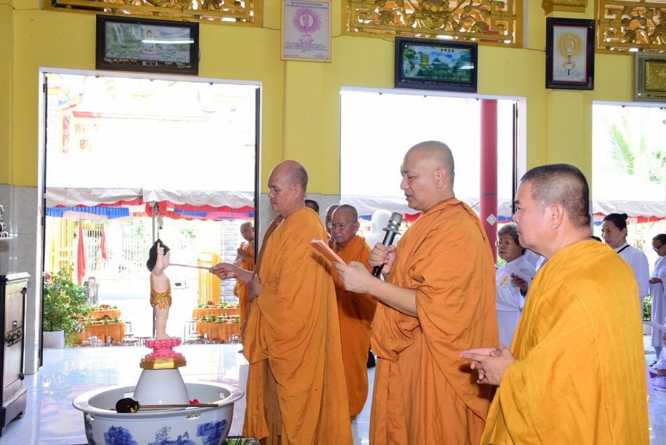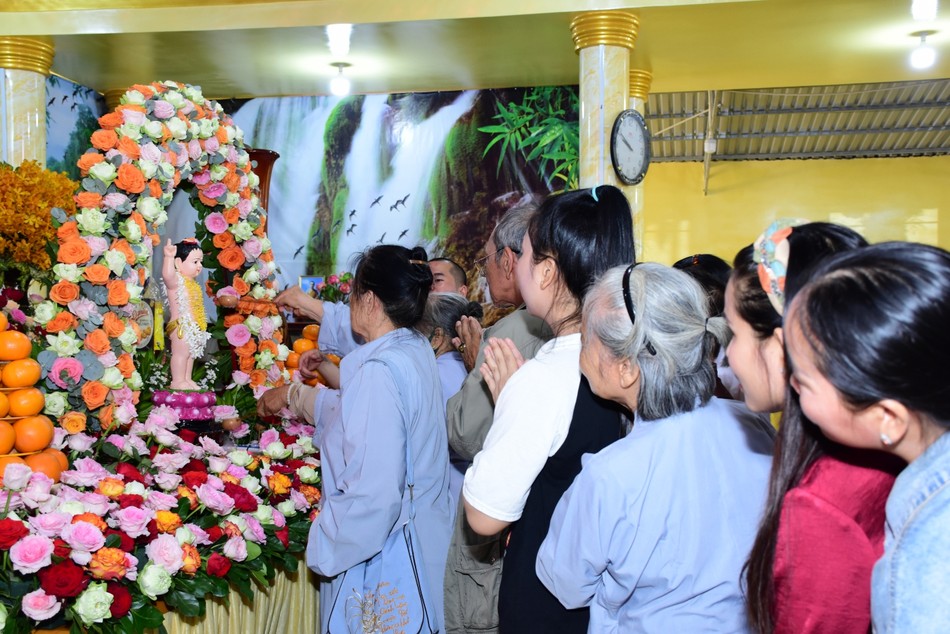 Sau thời tụng kinh của nhóm Phật tử Hoa Anh Đào, Hòa thượng Giác Điệp cùng chư tôn đức Tăng và hơn 200 Phật tử vân tập tại giảng đường niêm hương bạch Phật, trang nghiêm cử hành nghi thức Tắm Phật truyền thống.
