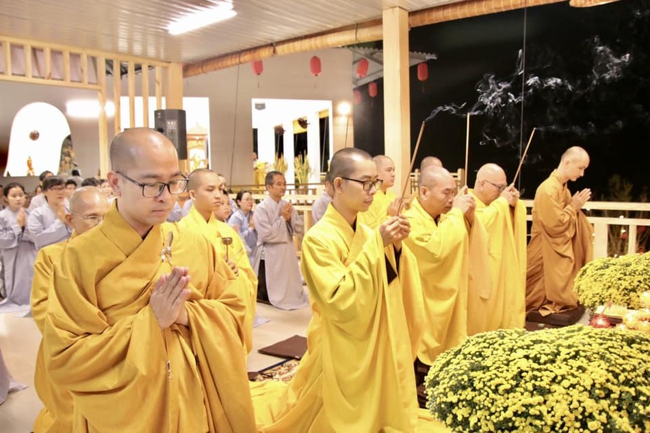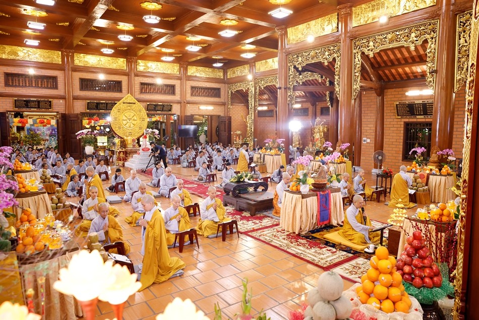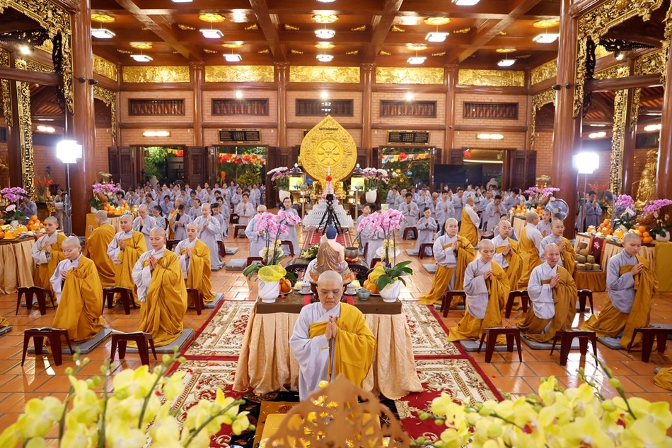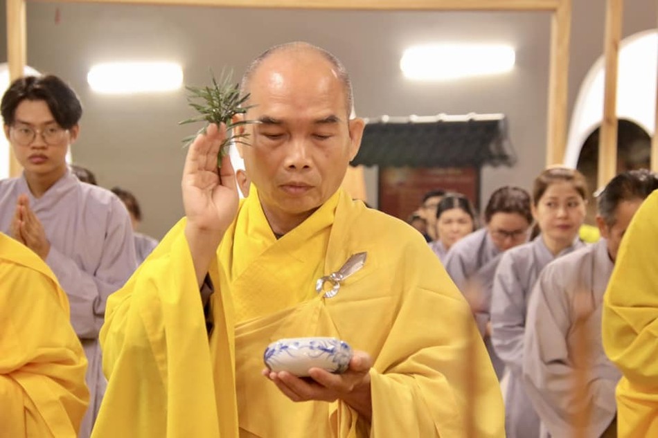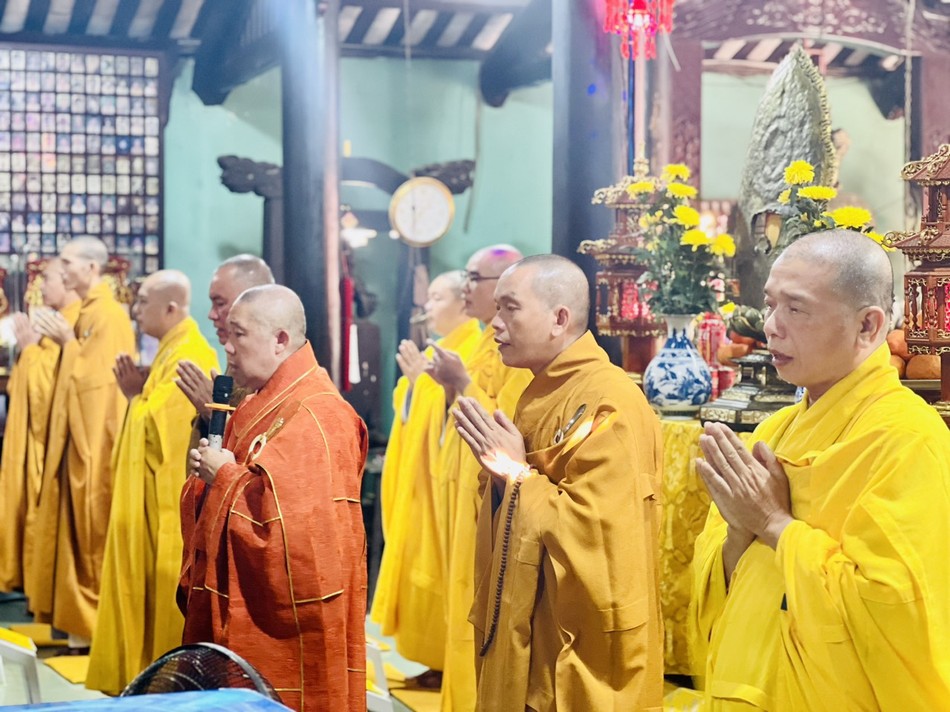 Sau khi đảnh lễ chư lịch đại Tổ sư tại tổ đường, chư Tăng đã quang lâm chánh điện cử hành nghi thức niêm hương bạch Phật, sái tịnh đàn tràng.