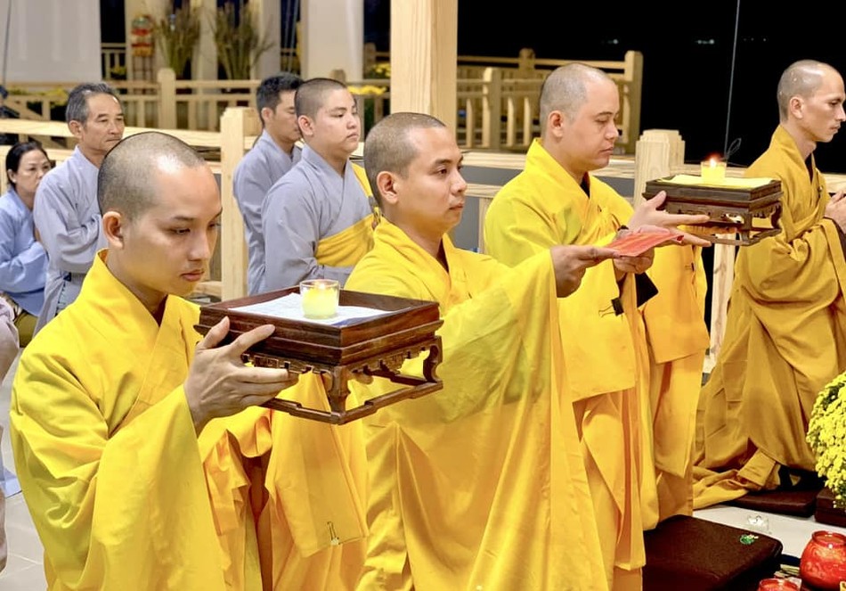 Thượng tọa Thích Hoằng Thạnh, đương vi sám chủ cung tuyên văn sớ kỳ an chính thức khai đàn tiêu tai diên thọ. Sau đó, đại chúng đồng phúng tụng kinh văn Dược Sư bổn nguyện công đức và nhiễu đăng cầu nguyện.