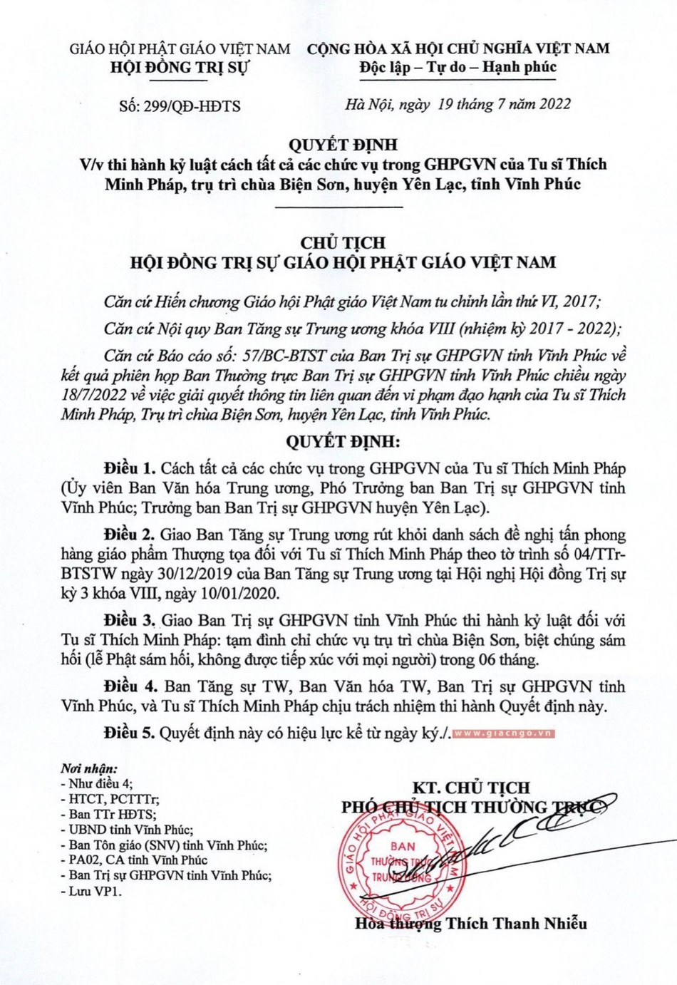 Theo đó, Giáo hội quyết định cách tất cả chức vụ Ủy viên Ban Văn hóa Trung ương, Phó Trưởng ban Ban Trị sự GHPGVN tỉnh Vĩnh Phúc, Trưởng ban Ban Trị sự Phật giáo huyện Yên Lạc được suy cử và chuẩn y trước đó đối với tu sĩ Thích Minh Pháp.