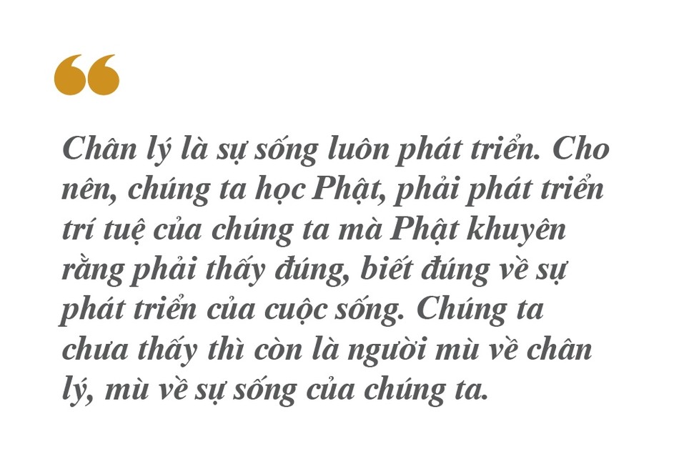 Vì vậy, thực hiện ý Phật dạy phải tu cho đôi mắt sáng mới thấy được chân lý. Mà chân lý luôn biến chuyển, thay đổi, không bao giờ cố định. Chính vì lý này, Phật thuyết pháp 49 năm, nhưng Ngài nói đó là phương tiện, sự việc qua rồi, đừng chấp vô giáo pháp.