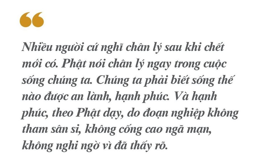 Nhiều người cứ nghĩ chân lý sau khi chết mới có. Phật nói chân lý ngay trong cuộc sống chúng ta. Chúng ta phải biết sống thế nào được an lành, hạnh phúc. Và hạnh phúc, theo Phật dạy, do đoạn nghiệp không tham sân si, không cống cao ngã mạn, không nghi ngờ vì đã thấy rõ.