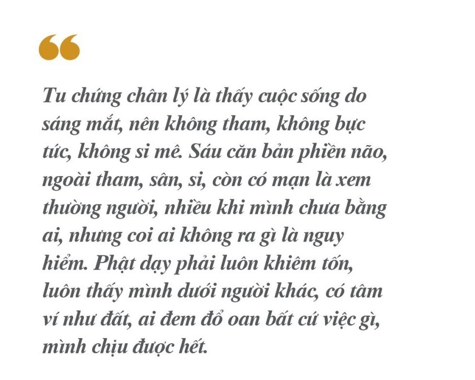 Tu chứng chân lý là thấy cuộc sống do sáng mắt, nên không tham, không bực tức, không si mê. Sáu căn bản phiền não, ngoài tham, sân, si, còn có mạn là xem thường người, nhiều khi mình chưa bằng ai, nhưng coi ai không ra gì là nguy hiểm. Phật dạy phải luôn khiêm tốn, luôn thấy mình dưới người khác, có tâm ví như đất, ai đem đổ oan bất cứ việc gì, mình chịu được hết.