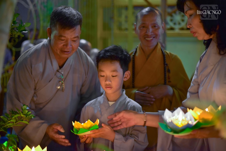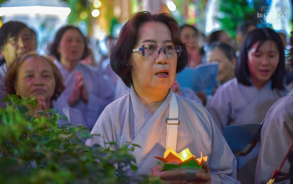 Sau đó, mọi người cùng nhau thiền hành, nhiễu tháp và thắp nến tưởng niệm dưới tôn tượng Bồ-tát.