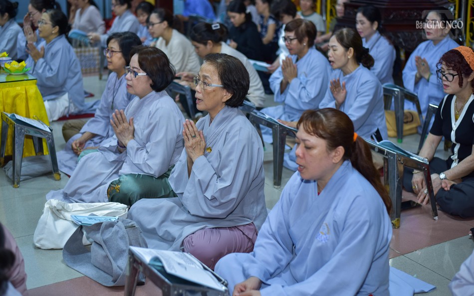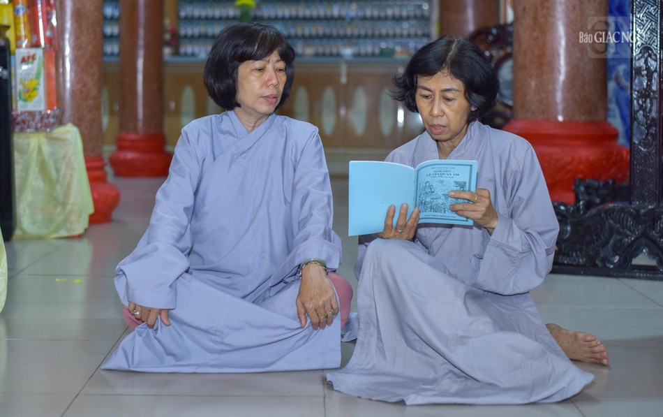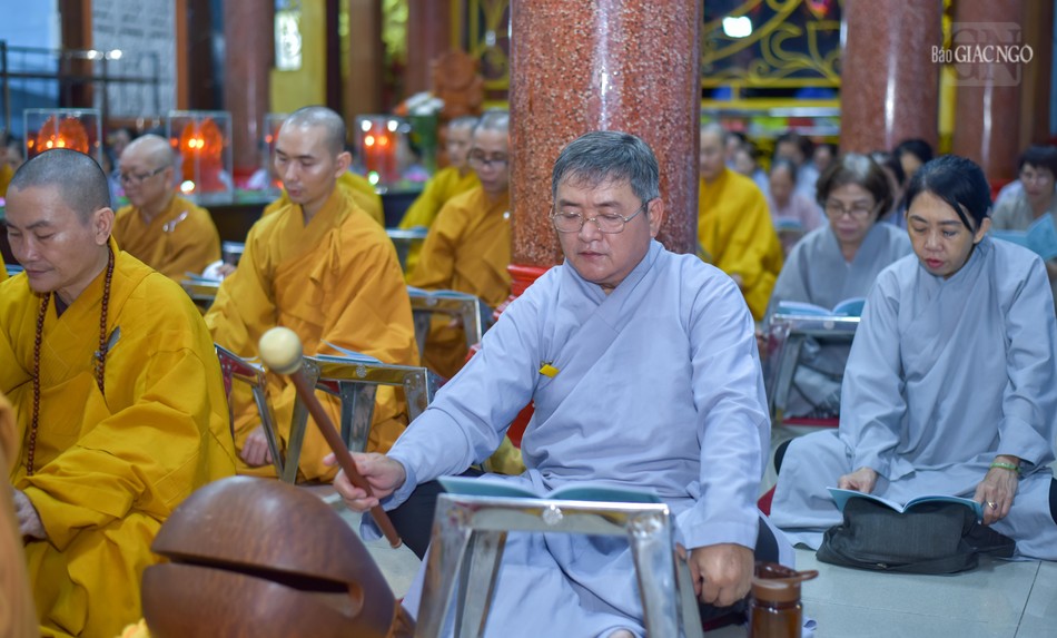 Trước chánh điện tổ đình Vạn Thọ, Thượng tọa Thích Minh Quang, Trưởng ban Trị sự GHPGVN Q.1, quyền trụ trì tổ đình Vạn Thọ hướng dẫn đại chúng trì tụng phẩm Phổ môn để cùng nhau ôn lại những hạnh nguyện cao quý của Bồ-tát Quán Thế Âm.